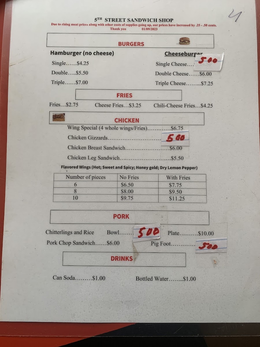 Shirley's Soul Food 5th Street Sandwich Shop Menu